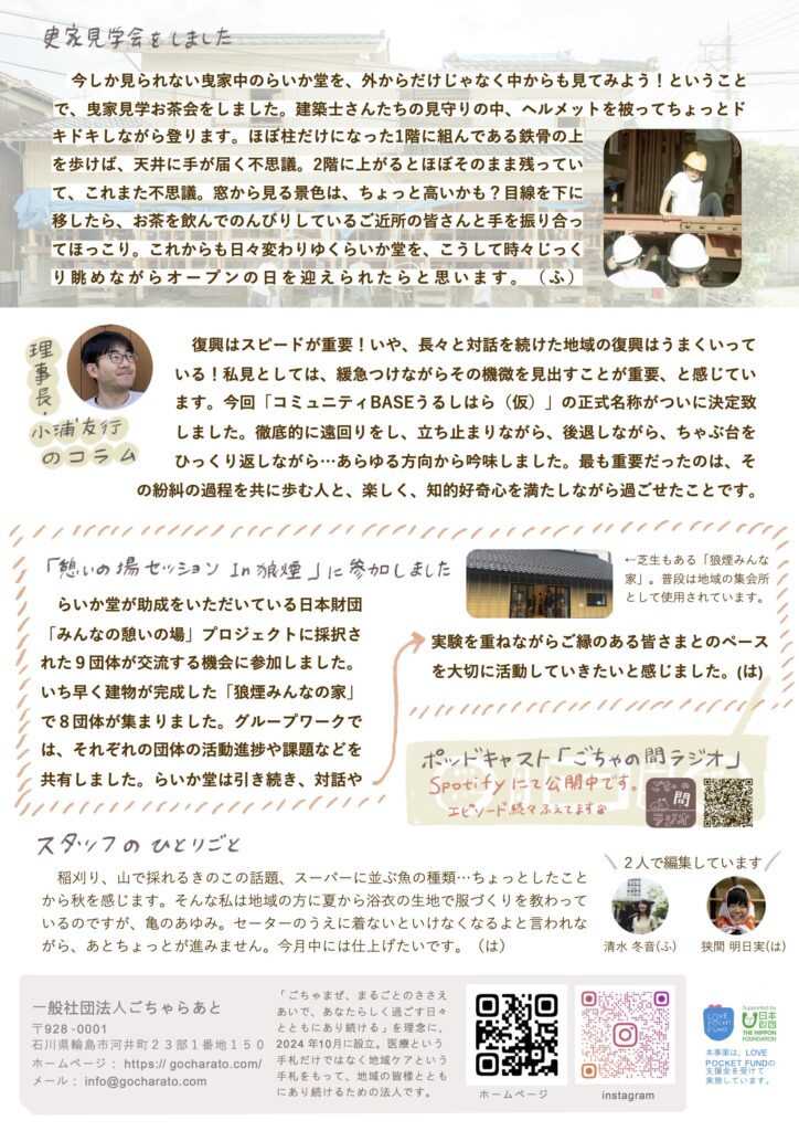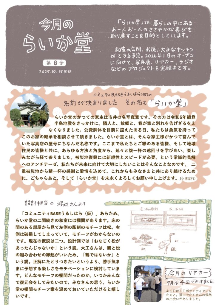 今月のらいか堂8号、発行しました お知らせ 2025.10.212025.10.238号(10月15日発行)は、名称が決まったこと(先日もお知らせしましたが、「らいか堂」になりました!)、曳家工事の見学会を行ったことなどについてお伝えしています。見かけた際はぜひお手に取ってご覧ください。▼こちらからもご覧ください。