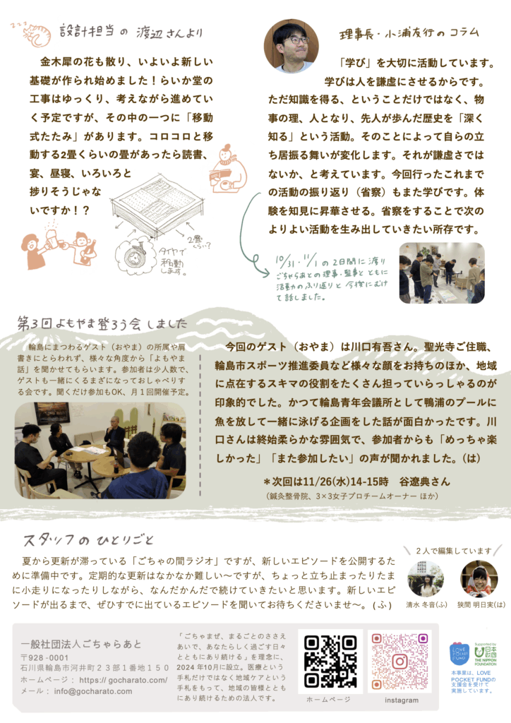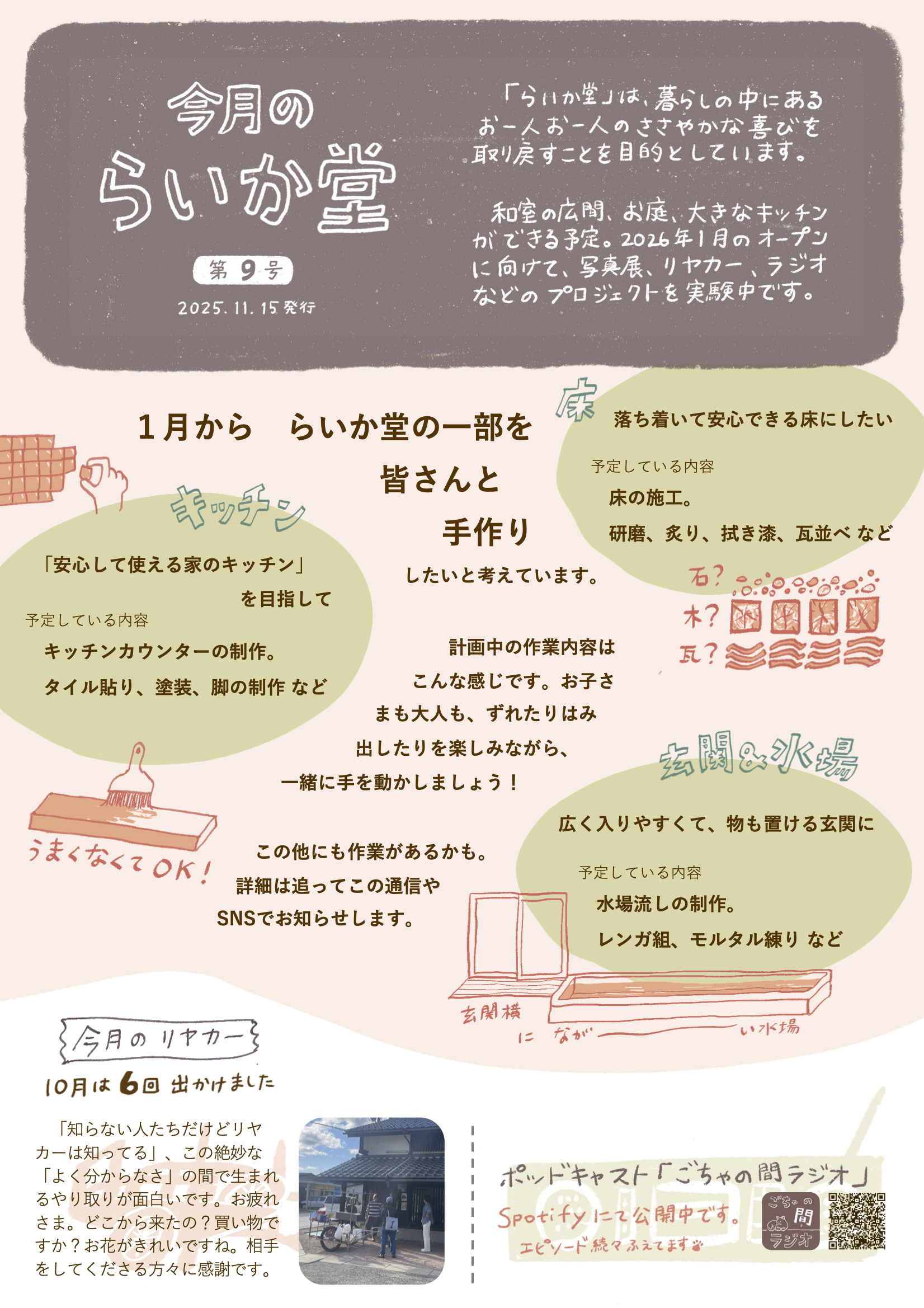 今月のらいか堂9号、発行しました お知らせ 2025.11.189号(11月15日発行)は、1月から、らいか堂の一部(内装など)を皆さんと手作りしたいこと、第3回よもやま登ろう会の開催報告などについてお伝えしています。見かけた際はぜひお手に取ってご覧ください。▼こちらからもご覧ください