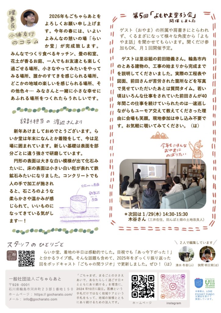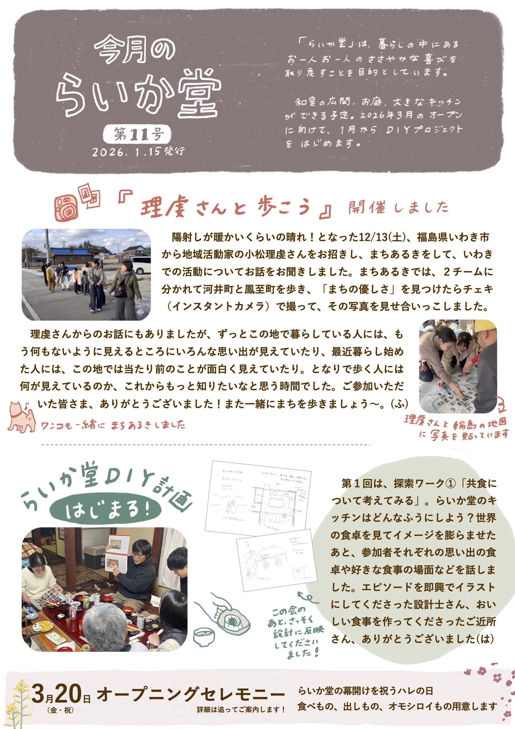 今月のらいか堂11号、発行しました お知らせ 2026.01.2611号(1月15日発行)は、12月に開催した「理虔さんと歩こう」のご報告、始まったDIY計画のこと、第5回よもやま登ろう会の開催報告などについてお伝えしています。見かけた際はぜひお手に取ってご覧ください。▼こちらからもご覧ください