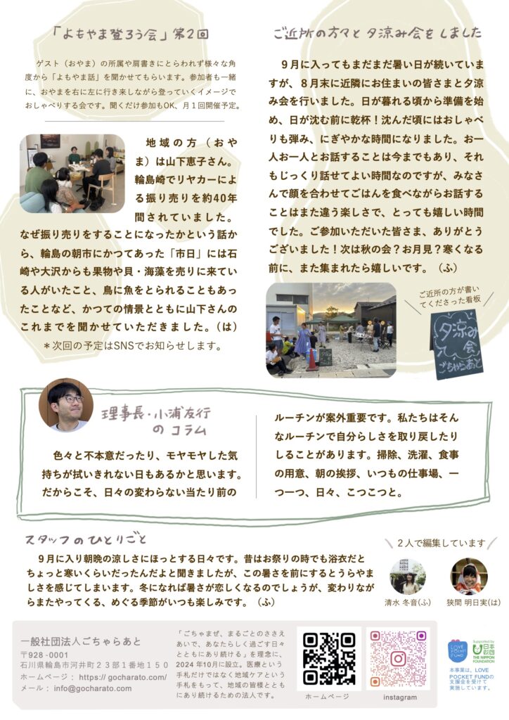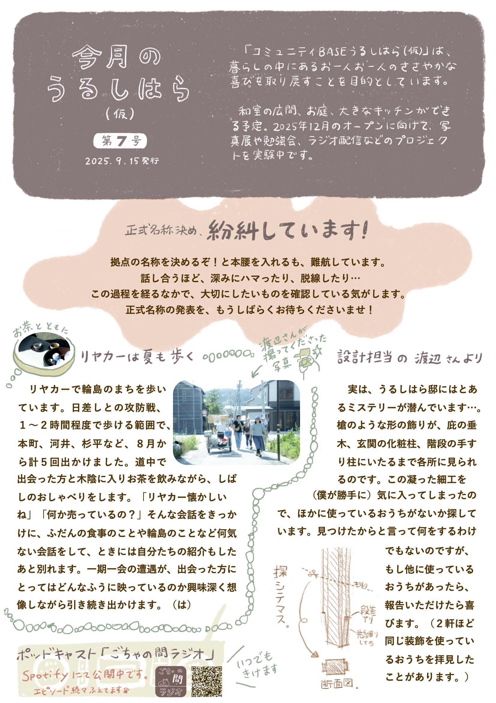 今月のうるしはら(仮)7号、発行しました お知らせ 2025.09.152025.10.107号(9月15日発行)は、正式名称決めについて、リヤカーの活動などについてお伝えしています。見かけた際はぜひお手に取ってご覧ください。▼こちらからもご覧ください。