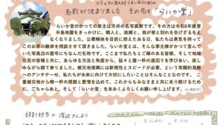 お知らせ今月のらいか堂8号、発行しました 8号(10月15日発行)は、名称が決まったこと(先日もお知らせしましたが、「らいか堂」になりました!)、曳家工事の見学会を行ったことなどについてお伝えしています。見かけた際はぜひお手に取ってご覧ください。▼こちらからもご覧ください。 2025.10.21お知らせ