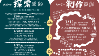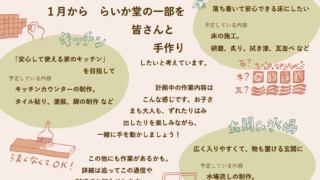 お知らせ『らいか堂DIY計画』スタートします 「DIY(どんどん いろいろ やってみよう)」のとおり、さまざまな【探索】と【制作】を行き来しながら、らいか堂ができるまでを皆さんと共有したいと思っています。***2026年3月のオープンに向けて、今年の7月から工事が始まりました。基礎工事... 2025.12.05お知らせ